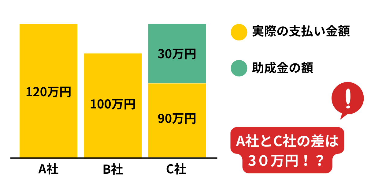 しかも、下記の例ではA社とC社の見積もり額は同じですが、C社は助成金対応しているので、結果的に最安のB社よりも安くなっています。