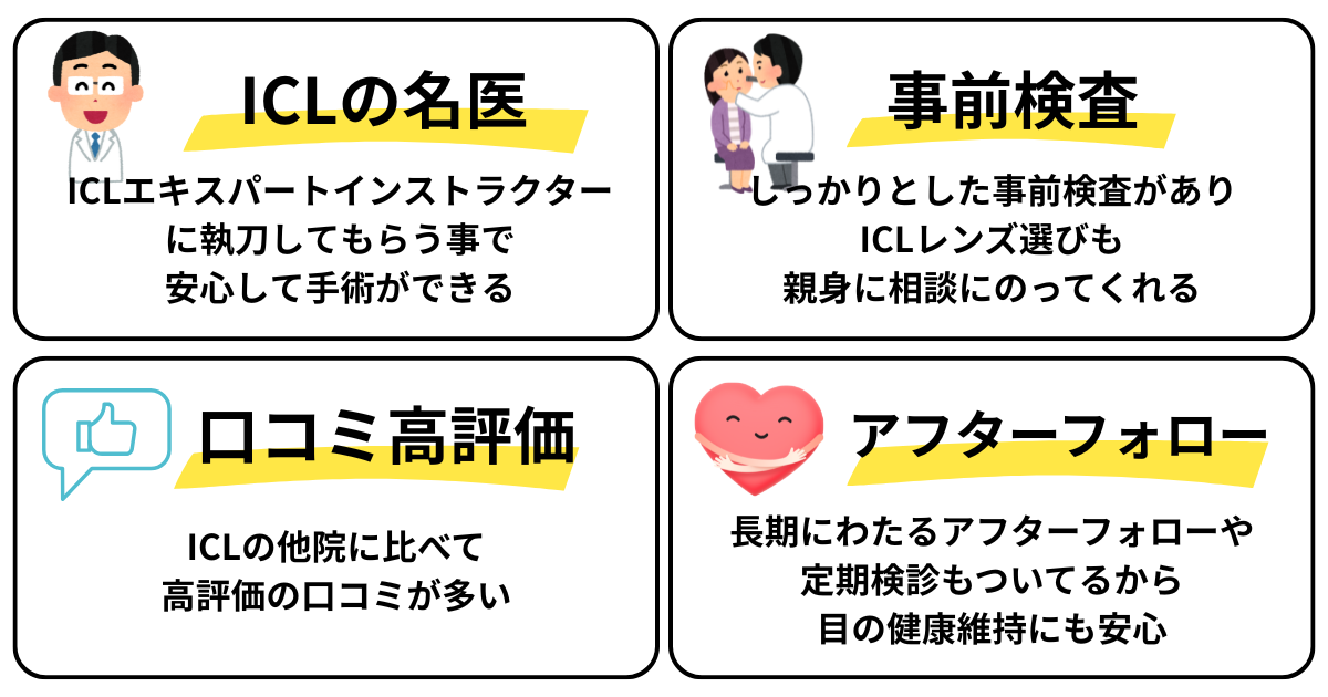私はICLエキスパートインストラクターの多いアイクリニック東京を選びました。